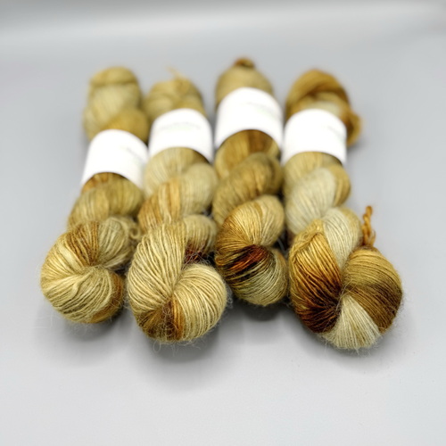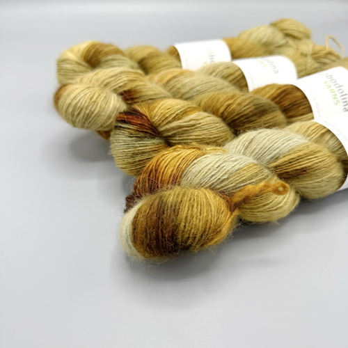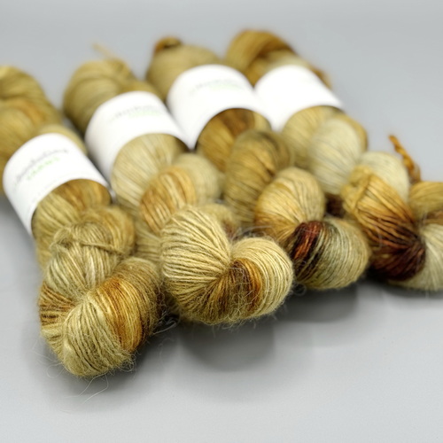 The yarn is completely processed and finished on site by the farmers, which is very often simply not the case. The yarn was spun by different people. However, I make sure that I always dye a color batch from yarn that was also spun by one person. For this reason, the base color and contrast may have different “drillings”. When knitting the base color, make sure that you thread in a subsequent skein in good time, as even the skeins take on the color pigment differently due to their natural texture. But that is precisely the charm of this yarn.