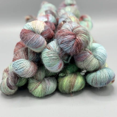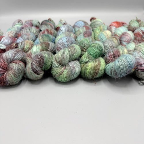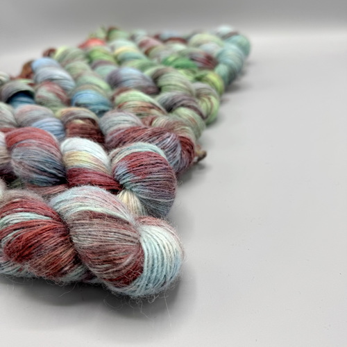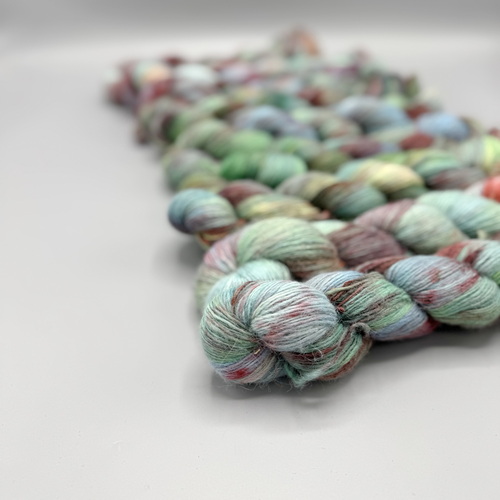 The yarn is dyed by me in small batches with heavy metal-free colors. These colors are not “garish” and can actually always be combined with each other, as the dyes are very harmonious