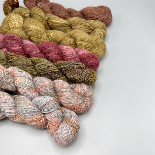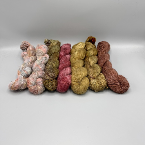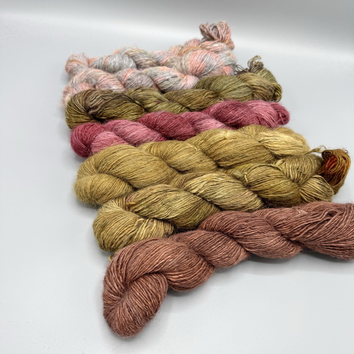 The yarn is dyed by me in small batches with heavy metal-free colors. These colors are not “garish” and can actually always be combined with each other, as the dyes are very harmonious