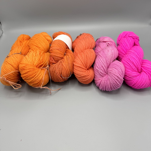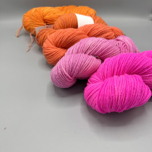 A yarn package for the Bottoni Cardigan by Isabell Kraemer: 6 skeins are dyed in a gradient from pink to orange