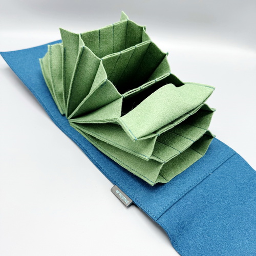 This Needlebag offers you 6 compartments for storing DPN`s with a length of 20 cm. There are also 9 compartments for DPN`s (15 cm) or crochet hooks. There are a further 6 compartments for the tips of rope systems and for 15 cm DPN`s or crochet hooks. Between the compartments for DPN`s and tips there are generous compartments that are ideal for storing circular knitting needles or ropes.