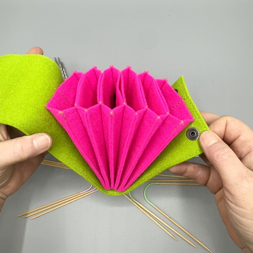 It was specially designed for knitting needles such as Neko, Addi Crazy Trio, Hiya Hiya Flyers and other small circular knitting needles. The wool felt protects your needles from damage and ensures that they always stay in place.