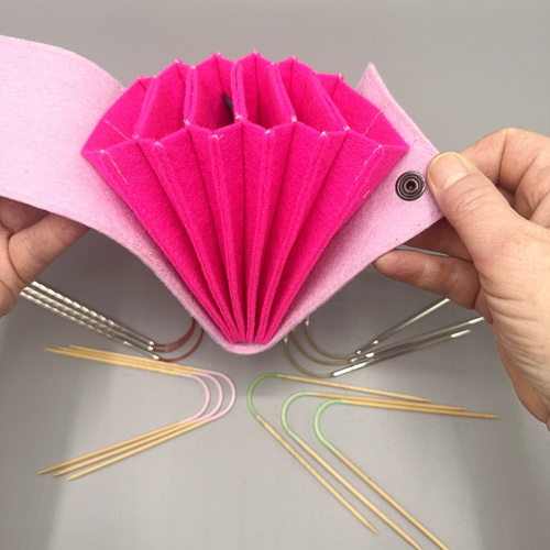 It was specially designed for knitting needles such as Neko, Addi Crazy Trio, Hiya Hiya Flyers and other small circular knitting needles. The wool felt protects your needles from damage and ensures that they always stay in place.