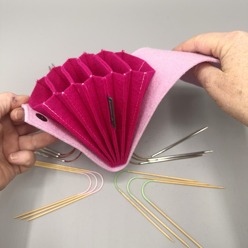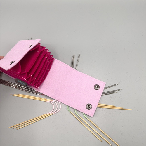 It was specially designed for knitting needles such as Neko, Addi Crazy Trio, Hiya Hiya Flyers and other small circular knitting needles. The wool felt protects your needles from damage and ensures that they always stay in place.
