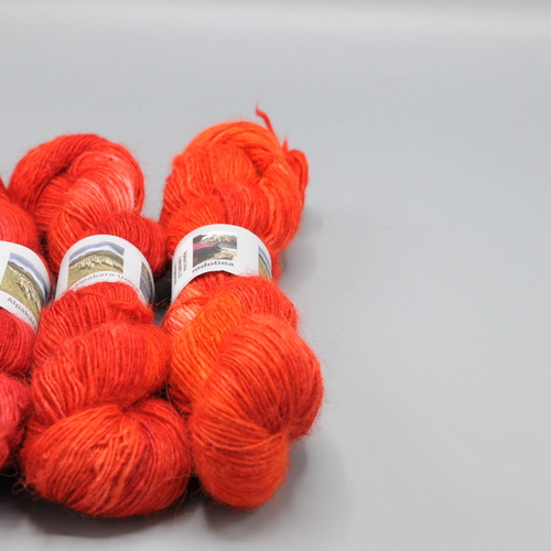 Das Garn wird vorort komplett von den Bauern verarbeitet und veredelt, was sehr häufig einfach nicht der Fall ist. Das Garn wurde von unterschiedlichen Personen gesponnen. Ich achte jedoch darauf, dass ich eine Farbpartie immer von Garn färbe, dass auch von einer Person gesponnen wurde. Daher kommt es vor, dass Grundfarbe und Kontrast unerschiedliche „drillungen“ hat. Beim Verstricken der Grundfarbe darauf zu achten, dass man rechtzeitig einen Folgestrang einfadet, da selbst die Stränge aufgrund der natürlichen Beschaffenheit das Farbpigmet unterschiedlich annimmt. Aber genau das ist der Charme dieses Garns.