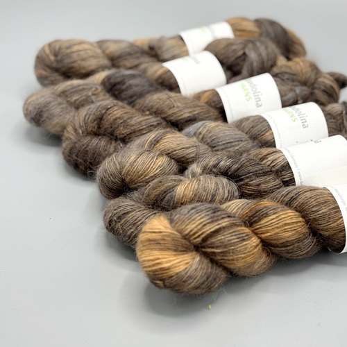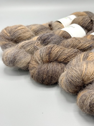 Das Garn wird vorort komplett von den Bauern verarbeitet und veredelt, was sehr häufig einfach nicht der Fall ist. Das Garn wurde von unterschiedlichen Personen gesponnen. Ich achte jedoch darauf, dass ich eine Farbpartie immer von Garn färbe, dass auch von einer Person gesponnen wurde. Daher kommt es vor, dass Grundfarbe und Kontrast unerschiedliche „drillungen“ hat. Beim Verstricken der Grundfarbe darauf zu achten, dass man rechtzeitig einen Folgestrang einfadet, da selbst die Stränge aufgrund der natürlichen Beschaffenheit das Farbpigmet unterschiedlich annimmt. Aber genau das ist der Charme dieses Garns.