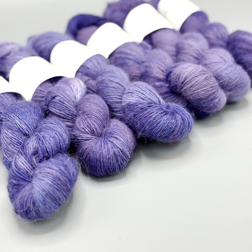 Das Garn wird durch mich in kleinen Chargen mit schwermetallfreien Farben gefärbt. Diese Farben sind nicht „grell“ und können eigentlich immer miteinander kombiniert werden, da die Färbungen sehr harmonisch sind