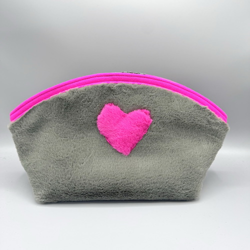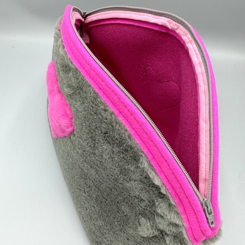 großer Projektbeutel in flauschigem Schlamm, eingefasst mit pinken Filz , Reissverschluss in anthrazit, innen Filz in Pink …. mit pinken Flauschherz