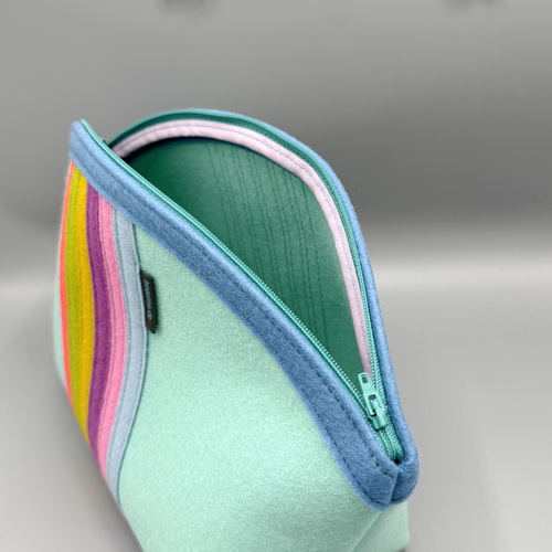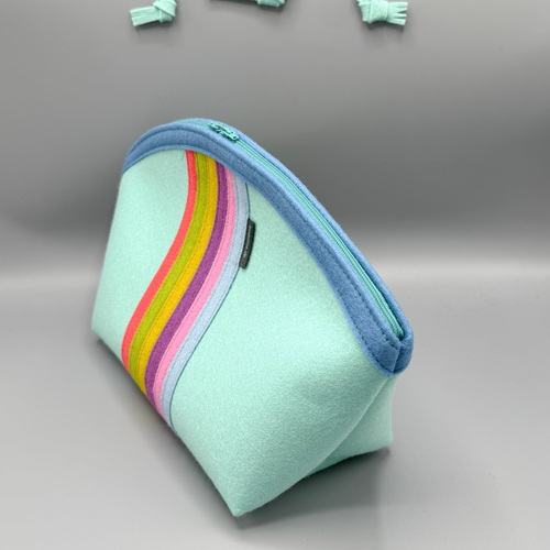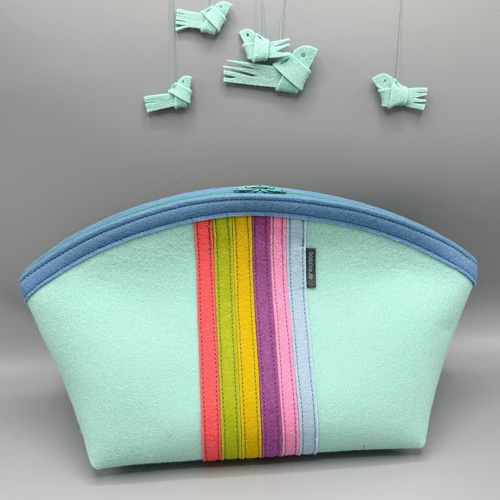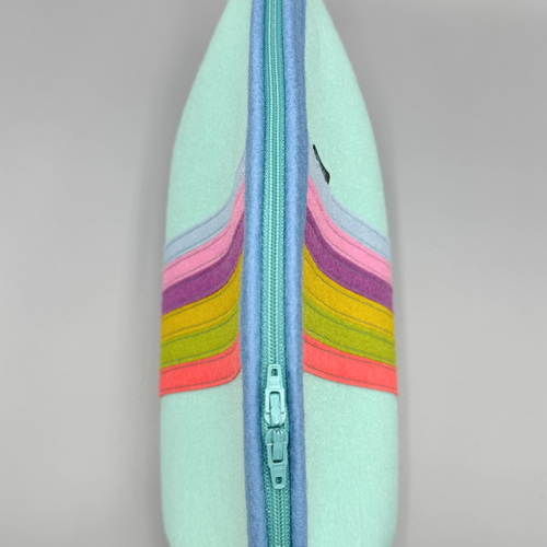 Der Projektbeutel ist aus reinem Wollfilz (2 mm) angefertigt. Die obere Kante und der Reißverschluss sind mit Schrägband eingefasst, was äußerst hübsch anzusehen ist. Am Reißverschluss sind zwei Zipper angebracht, damit die Öffnung individuell eingestellt werden kann. So kann der Beutel während des Strickens geschlossen werden, wobei nur noch eine kleine Öffnung für das Garn bleibt.