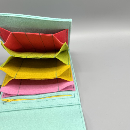 Im Deckel des Organizers ist ein kleines aber dennoch geräumiges Fach mit Reißverschluss eingearbeitet, in welchem z.B Stopper, Maschenmarkierer, Maßsband, Reihenzähler und vieles mehr verstaut werden kann.