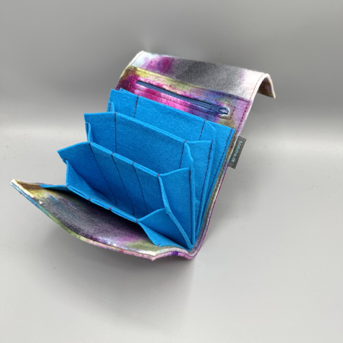 Im Deckel des Organizers ist ein kleines aber dennoch geräumiges Fach mit Reißverschluss eingearbeitet, in welchem z.B Stopper, Maschenmarkierer, Maßsband, Reihenzähler und vieles mehr verstaut werden kann.