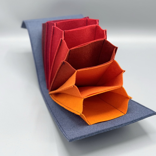 Die Tasche verfügt über 7 Fächer mit einer Größe von etwa 12 x 16 cm sowie 8 Fächer, die jeweils ca. 6,5 x 16 cm messen (zwei davon befinden sich an den Seiten des Deckels).