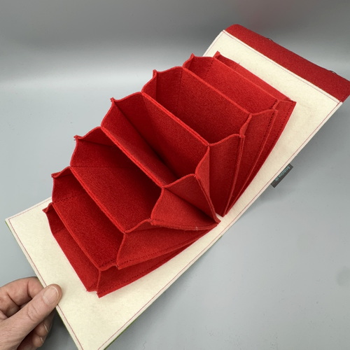 Die Tasche verfügt über 7 Fächer mit einer Größe von etwa 12 x 16 cm sowie 8 Fächer, die jeweils ca. 6,5 x 16 cm messen (zwei davon befinden sich an den Seiten des Deckels).